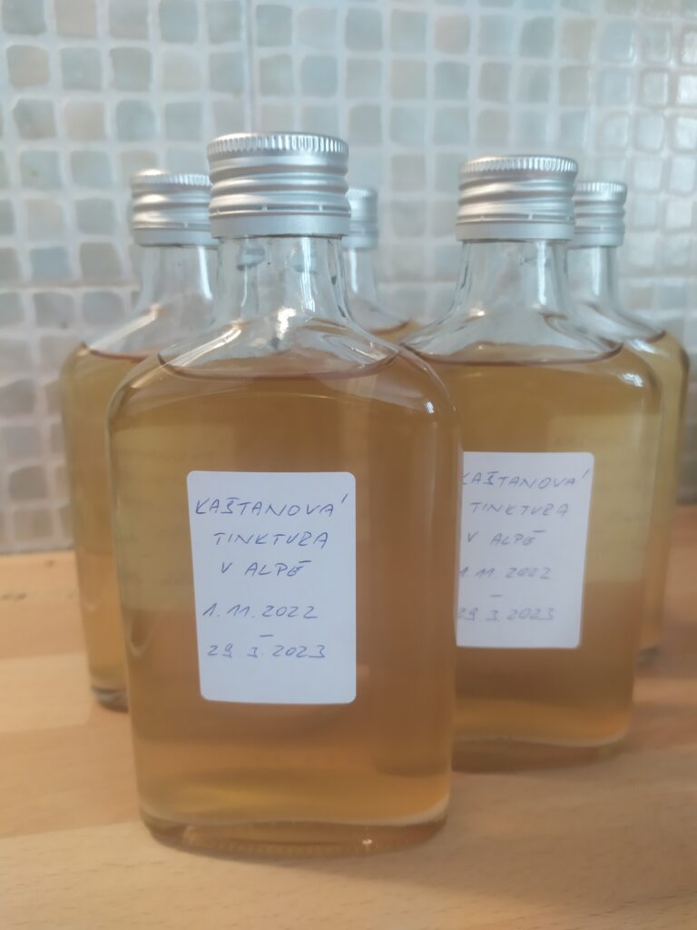 Do ještě teplé, ale již mírně zchladlé směsi následně přidám propolisovou tinkturu a 100 ml kaštanové tinktury (připravené macerací plodů jírovce v lihu). Tyto alkoholové extrakty přinášejí další spektrum biologicky aktivních látek – zejména flavonoidy, escin (u kaštanu), fenolické sloučeniny a pryskyřičné látky s výrazným účinkem na cévní systém a regeneraci tkání.