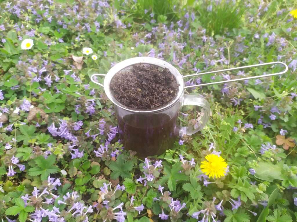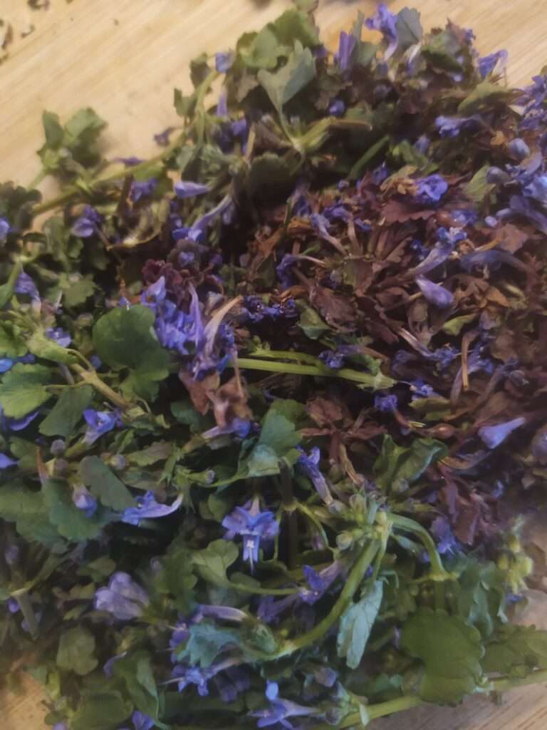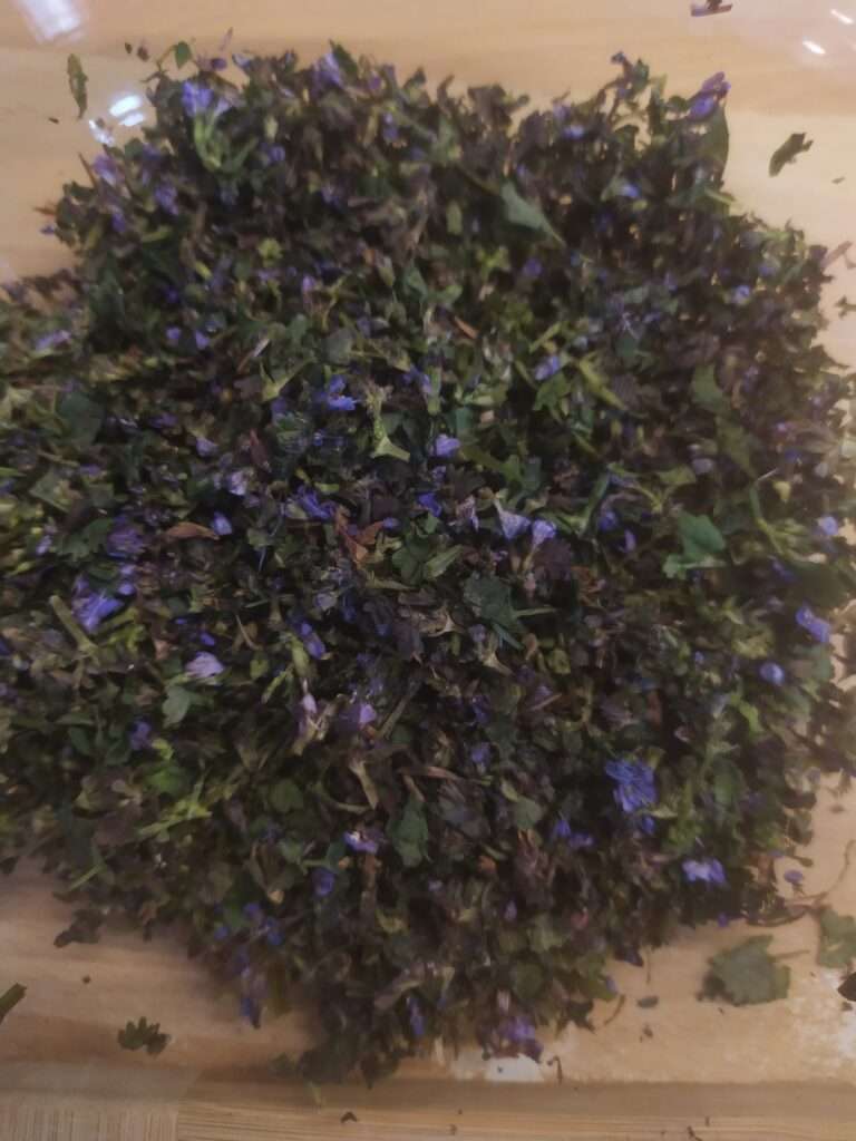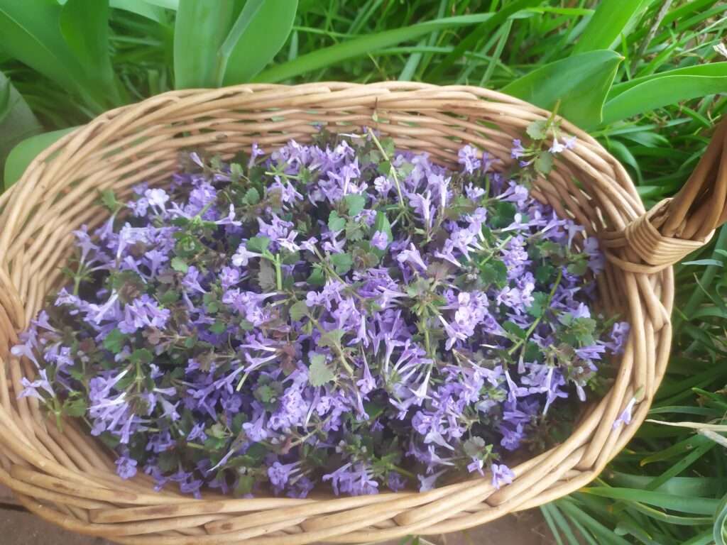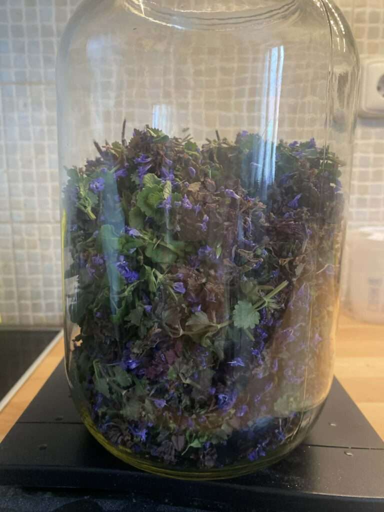 Základem masti je olejový macerát z kvetoucí natě popence břečťanolistého (Glechoma hederacea). Bylinu sbírám za suchého, slunného počasí, ideálně v období plného květu, kdy obsahuje maximum biologicky aktivních látek. Čerstvě nasbíranou nať nechávám přibližně 24 hodin zavadnout, čímž snížím obsah volné vody v pletivech. Tento krok považuji za zásadní – při výrobě oleje za studena tím výrazně omezuji riziko mikrobiální kontaminace a zvyšuje se stabilita výsledného macerátu.